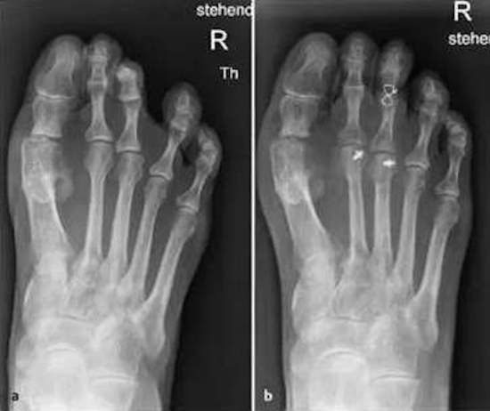 - Einlagenversorgung: Eine optimierte Einlagenversorgung kann zu einer Verbesserung der Stellung der Zehen führen. Ebenfalls kann eine Weichbettung und Aussparung im Bereich schmerzhafter Anteile zu Beschwerdelinderung beitragen.