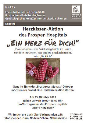 Die nächste Aktion findet am Samstag, 25. Oktober 2025, zwischen 10:00 und 18:00 Uhr im Vortragsraum (UG) im Prosper-Hospital statt. Auch Sachspenden wie Baumwollstoffe, Garn, Nadeln, Stoffkreide und Scheren werden benötigt. „Wir freuen uns über Helferinnen und Helfer mit und ohne Nähmaschinen, damit wir die Kissen auch weiterhin an unsere Patientinnen und Patienten verschenken können“, so Melanie Honrath. Sie betreut gemeinsam mit Sabrina Skora und Sarah von Dornis die Herzkissenaktion im Prosper-Hospital.
