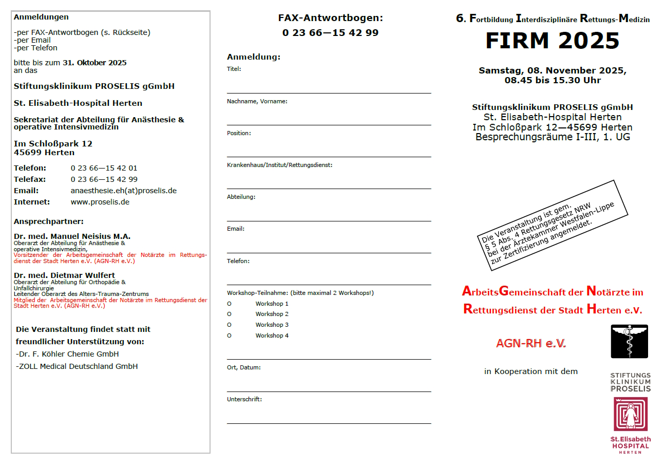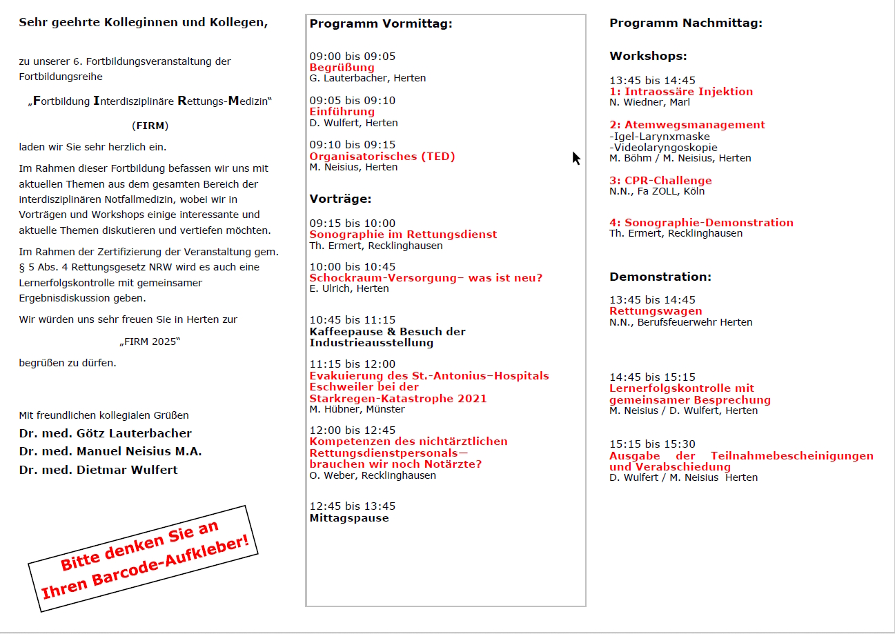 zu unserer 6. Fortbildungsveranstaltung der Fortbildungsreihe „Fortbildung Interdisziplinäre Rettungs-Medizin“ (FIRM) laden wir Sie sehr herzlich ein.