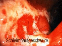 Die Colitis ulcerosa ist wie der Morbus Crohn eine chronisch entzündliche Darmerkrankung, die allerdings nur im Dick- und Mastdarm und nicht im Dünndarm vorkommt. Die Colitis ulcerosa befällt auch nur die Darmschleimhaut. Dies führt je nach Heftigkeit von einer Schleimhautschwellung bis hin zur vollständigen Zerstörung der Schleimhaut mit Geschwürbildung und daraus folgenden starken Blutungen oder Darmdurchbrüchen. Langanhaltende Verläufe können zur völligen Erstarrung der Darmwand führen.