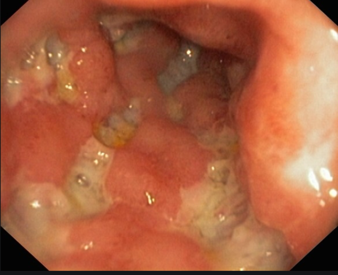 Typisch ist ein diskontinuierlicher Befall, das heißt neben erkrankten Abschnitten finden sich auch gesunde Anteile. Im Gegensatz zu Colitis ulcerosa, die auf die Schleimhaut begrenzt ist, sind beim Morbus Crohn immer alle Wandanteile des jeweiligen Darmabschnittes betroffen.