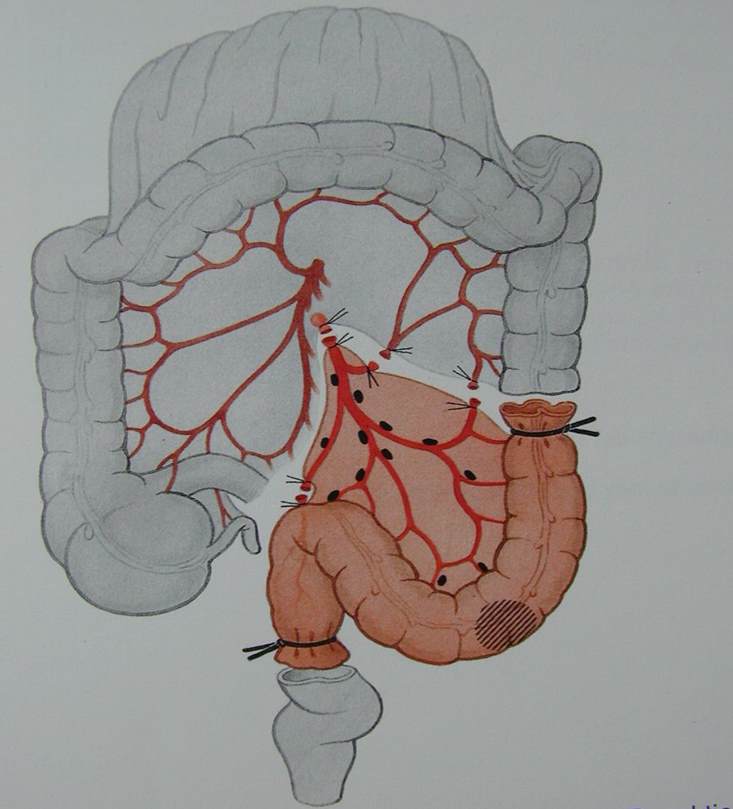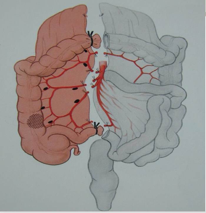 Dabei wird nicht nur der Tumor selbst entfernt, sondern auch die nähere Umgebung mit den Lymphabflussgebieten. Die Lymphe (Gewebswasser) wird in den Lymphknoten gefiltert und diese enthalten dann manchmal Tochtergeschwülste (Metastasen), wobei dies im Rahmen der Ausbreitungsdiagnostik vor der OP (CT, Sono MRT…) nicht festgestellt werden kann. Es werden deshalb die Lymphknoten, die dem Lauf der entsprechenden Arterien benachbart sind bei so einer OP prophylaktisch und therapeutisch mit reseziert. Die Grundsätze hierzu sind in den Leitlinien der Deutschen Krebsgesellschaft zur Therapie des Kolonkarzinoms festgelegt.